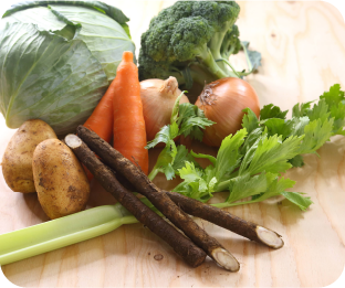 6種類の国産野菜を、それぞれの野菜の特徴とおいしさを引き出す最適なバランスで配合しました。素材そのもののやさしい甘みやうま味で味を整えています。
