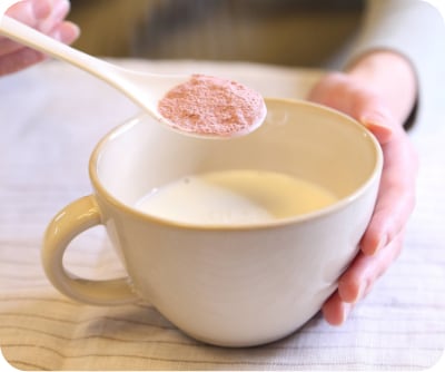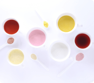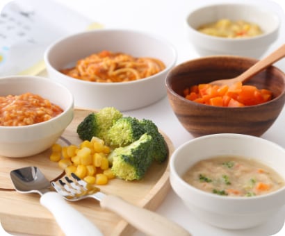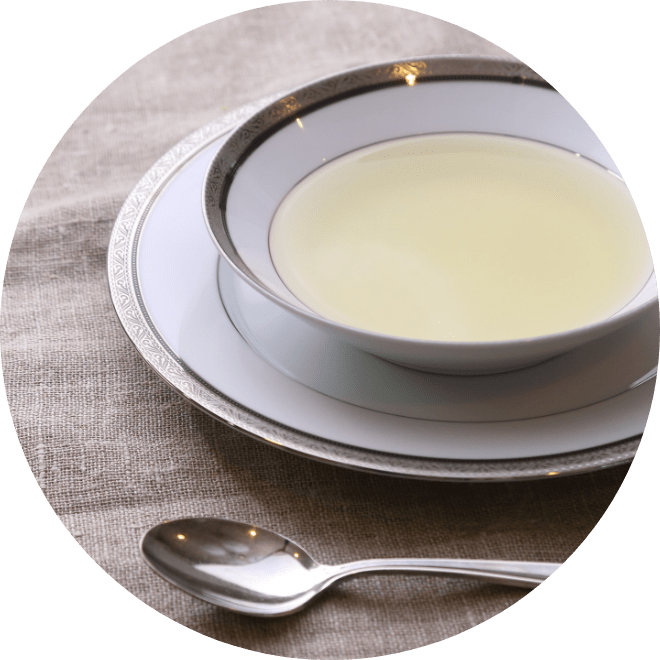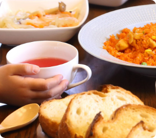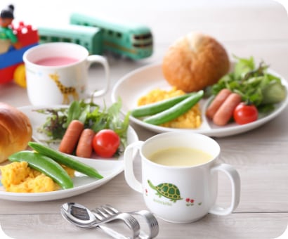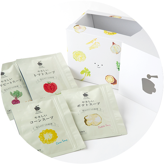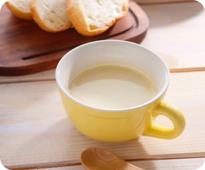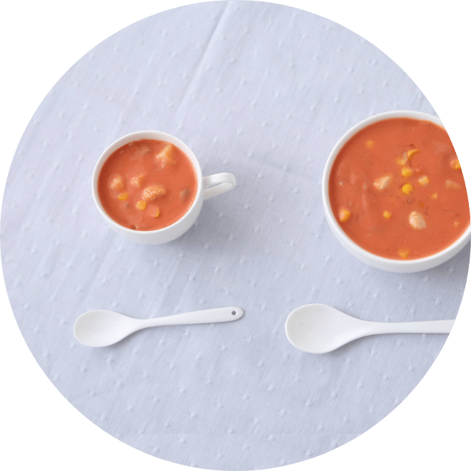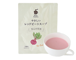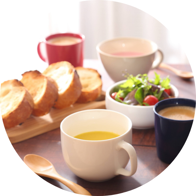 食卓に彩りを添えるカラフルなスープは、野菜の色がそのまま活かされています。牛乳を入れるとやさしい色合いに。今日はどの色のスープにしよう?選ぶのもたのしいひとときです。